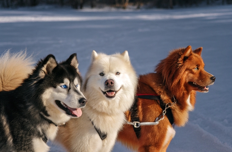 - Patas largas y fuertes, ideales para correr en la nieve.